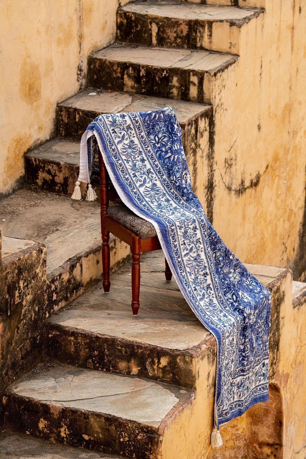 Each throw is handmade, requiring attention from 4 different types of artisans, including wood carvers, block printers, Kantha quiltmakers, and dye specialists.
